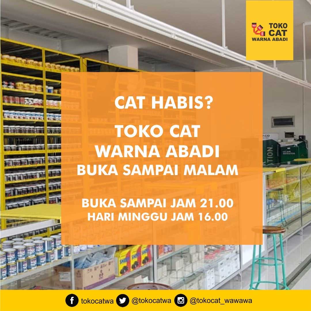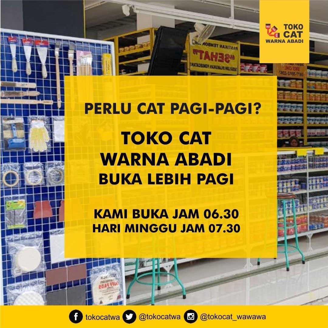 Solusi kebutuhan pengecatan Anda. Toko Cat WAWAWA buka setiap hari mulai dari pagi hari sampai dengan malam hari. Toko Cat WAWAWA merupakan usaha dari PT. Warna Abadi Mitra Bersama dengan jumlah gerai yang tersebar di Indonesia sebanyak 74 gerai.